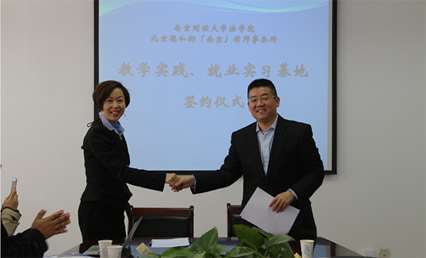 12月3日中午,我校法学院与北京德和衡(南京)律师事务所“教学实践、就业实习基地”签约仪式在仙林校区法政学科楼439会议室举行。德和衡律师事务所主任张艳、李展鹏等7位律师,法学院党政领导及部分师生参加了签约仪式。